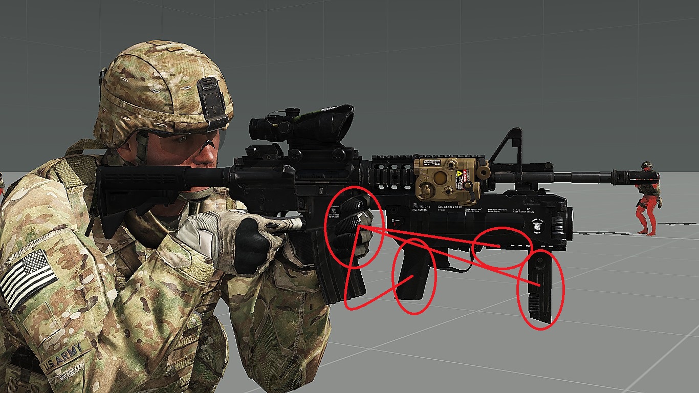 | Description | The hand placement on M4 M320's are in an awkward position grasping the magazine well. In reality the M320 itself adds 3.3 lbs to a 7.5 lb rifle, that isn't including attachments either. Realistically this would be extremely uncomfortable and impractical... Not to mention it causes multiple clipping issues. So for aesthetic reasons, the extended pistol grip on the M320 itself should serve its purpose as it does with the standalone variant. I've provided a picture reference below. |