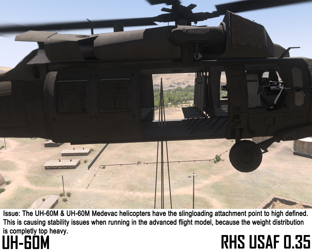 | Description | After the update to RHS 0.35, I encountered the issue with the UH-60M (& Medevac) with the location of the slingloading attachment point.