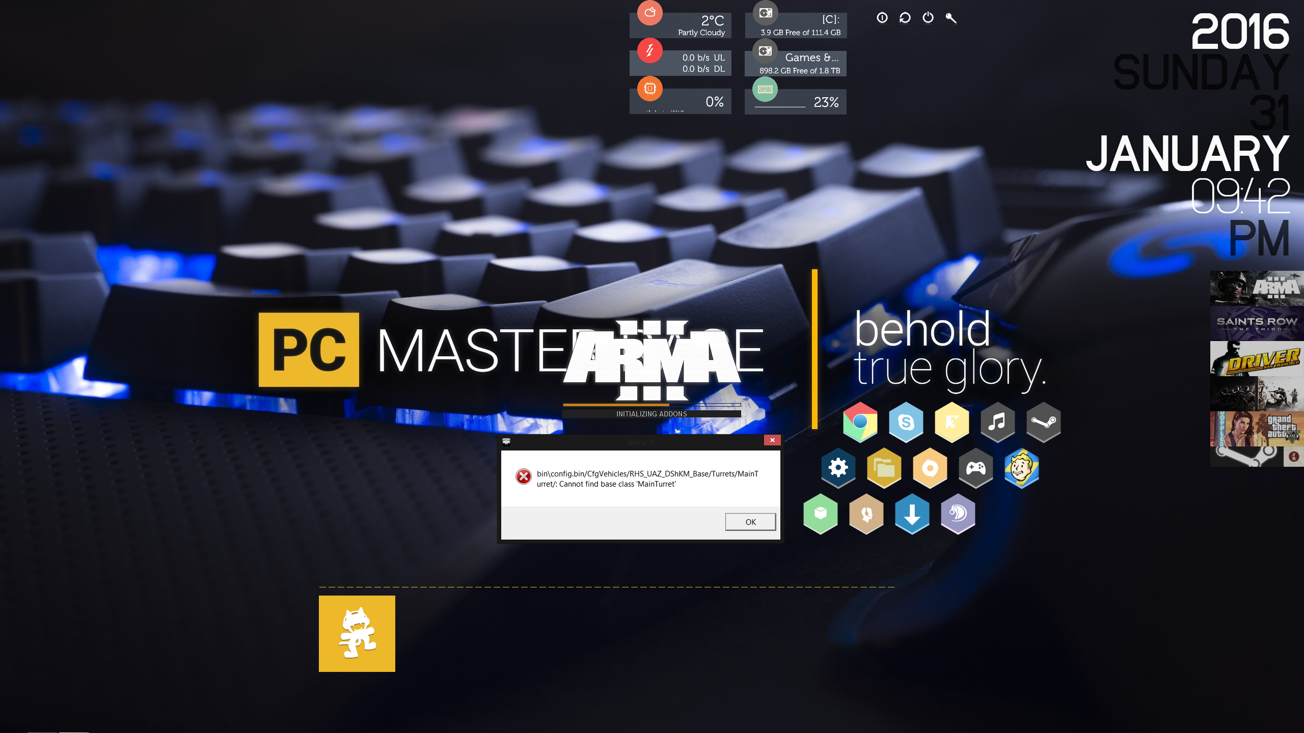 | Description | Hello! Whenever I try to start up Arma 3, the game gets to "Initializing Addons" and then crashes and throws up an error saying "bin\config.bin/CfgVehicles/RHS_UAZ_DShKM_Base/Turrets/MainTurret/: Cannot find base class 'Mainturret'". Could someone help me get the game running with RHS? I play the game with 80+ mods and every single one works with each other so it cant be them as the error directly specifies that its RHS:AFRF. | ||||||||