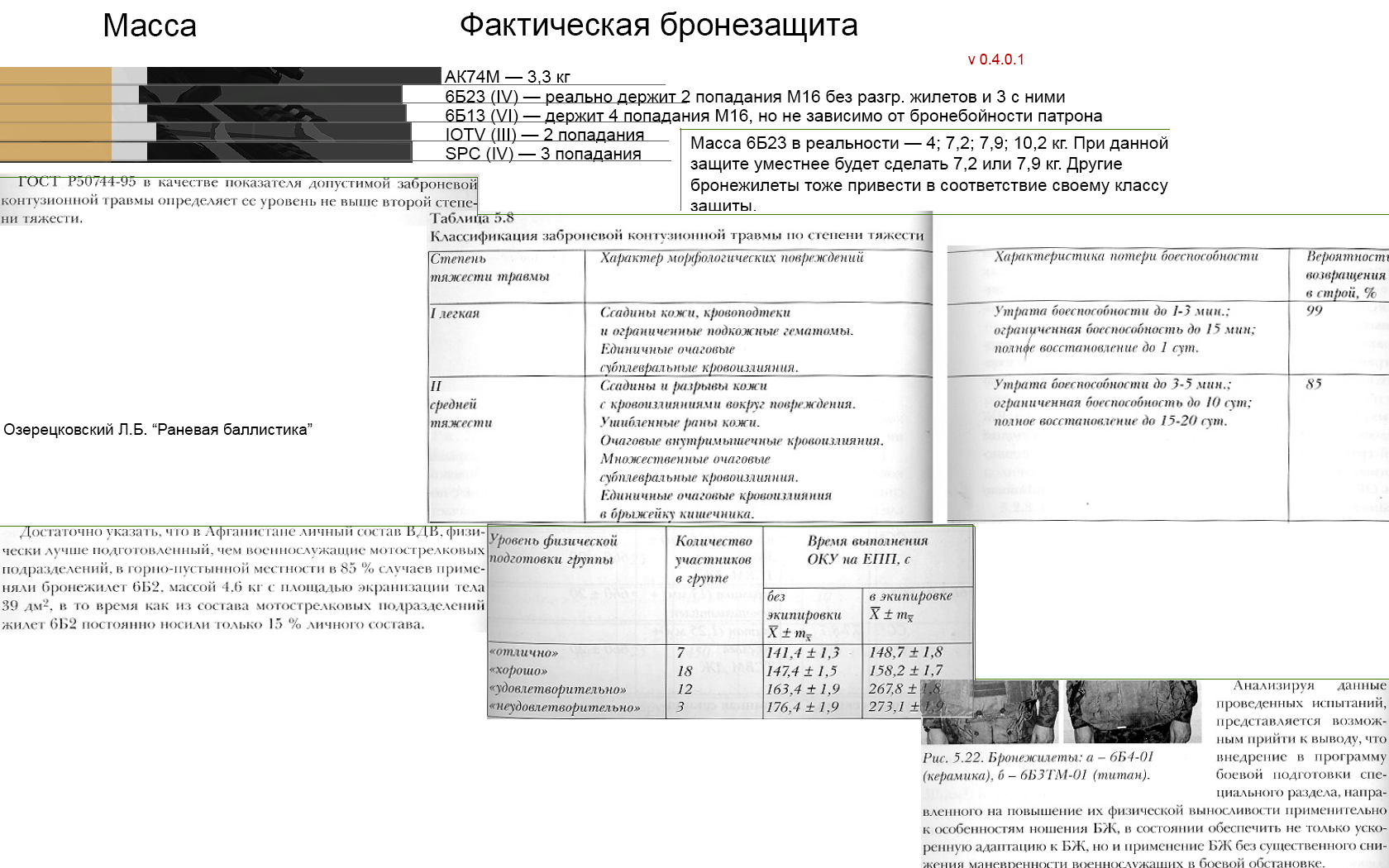 | Additional Information | Так же в этот файл прикрепляю вырезки из книги "Раневая баллистика" автора Озерецкого Л.Б. Я считаю что лучшим вариантом будет — сделать бронезащиту всех бронежилетов одинаковой. Или сделать все бронежилеты в двух вариантах, тяжелом и легком. Бронежилеты в реальности могут комплектоваться разными бронепластинами, так например с тяжелыми вариантами IOTV можно делать реальную армию США, а с легкими — армию при конфликте с РФ, что будет создавать баланс. В этой книге сказано, что бронежилеты создаются с расчетом на получение контузионной травмы второй степени, поскольку в ArmA не реализованы заброневые ранения, думаю будет правильным сделать бронежилеты держащими одно попадание, как сделали BIS в обновлении Nexus. Так же там сказано, что влияние бронежилета на выносливость солдата сильно зависит от показателя физической подготовки, поскольку в ArmA нет параметра физической подготовки — то, например, одев морскую пехоту в более тяжелые бронежилеты, получаются просто более "тяжелые" и медленные солдаты, тогда как в реальности они физически более подготовлены. | ||||||||
