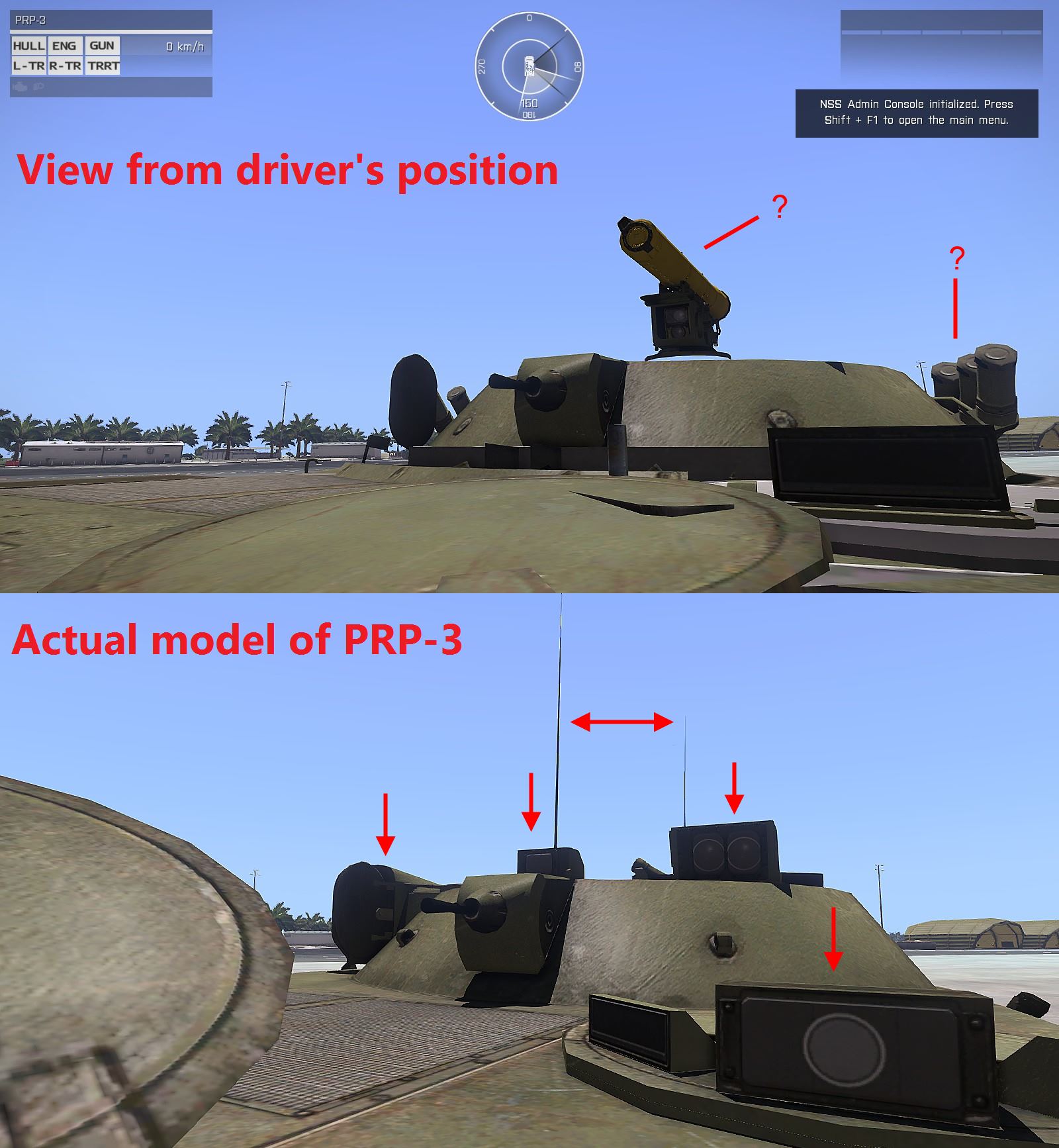 | Description | The model of PRP-3 that is visible for turned out driver is vastly different from the actual model of vehicle. Driver can see: 1. Non-existent Konkurs launcher 2. Non-existent smoke launchers on the left side of PRP-3's turret Driver cannot see: 1. Several optical periscopes on the turret 2. Optical periscope on commander's hatch (it's different form actual model) 3. Antennas 4. Some device attached to the right side of turret | ||||||||||||
