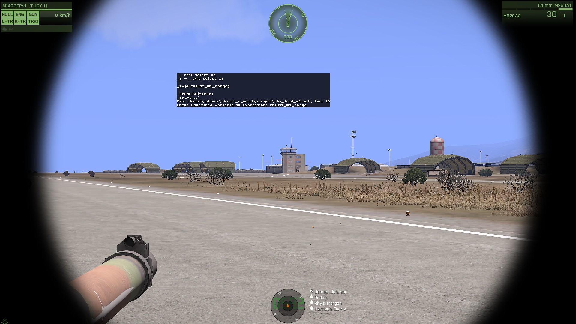 | Description | I've been using the M1A2s recently and came upon a ranging error, when trying to range targets. The function works, intermittently, I do know you need to range over 400m for it to work too. The problem is that it throws a scripting error when trying to range. I managed to take a screenshot of the error message that popped up because of the -showscripterrors startup parameter: RHS_lead_m1.sqf line 18.