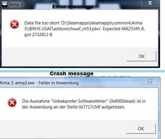 | Description | sorry for having to annoy you even though it´s propably my own fault. I first downlaoded the mod pasted it in my Arma 3 folder ... After i unloaded every other addon/mod I loaded RHS USAF . After i klicked play an error occured: >> Data files too short 'D:\Steamapps\steamapps\common\Arma3\@RHS USAF\addons\rhsusf_ch53.pbo '. Expected 66625345 B, got 2732812 B" << I closed the window the game just crashed leaving a window that statet: >> The Exeption "Uknown softwarefailure" (0x0000dead) has occured in the application at the point 0x7717c54f << | ||||||||