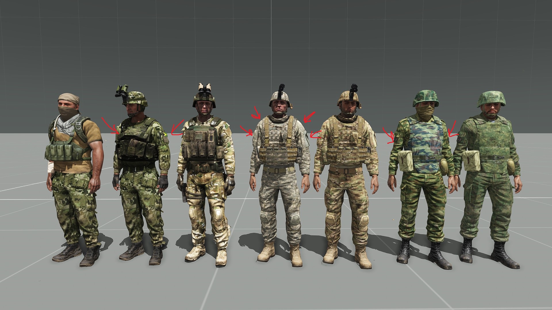 | Description | У указанной модели на мой взгляд слишком масивные плечи и руки, из-за чего солдат смотрится как-то неестественно, словно он игрущшечный солдатик с руками на шарнирах. Короче говоря у него не совсем человеческие пропорции, руки словно не растут из плечь, а просто к ним преклеены. Я предлагаю линию плечь сделать менее выпуклой, опустить ее немного и ужать ширину плечь. Так же можно сделать сами руки (рукава) немного тоньше. В качестве примера я вложил гифку. Плечи ужимал в Фотошопе в качестве образца использовал скрины пехотинца в белье и дефолтной форме НАТО. | ||||||||