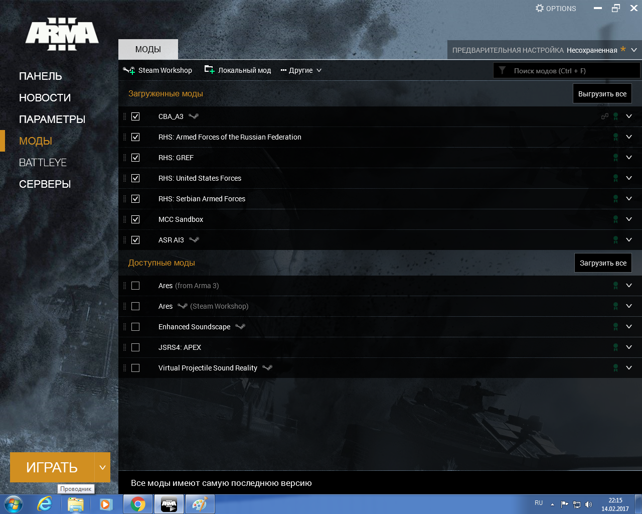 | Description | Здравствуйте уважаемые разработчики!!! За ваши труды большое вам спасибо мод прекрасный видно что над ним вы очень поработали но столкнулся и не только я с такой проблемой много форумов прочитал но я не как не нашел четкого ответа по решению проблемы. Я конечно не верю сильно что разработчики будут обращать внимание на таких как я но это действительно проблема и решения с версии 0.3.8 так и не была устранена. Вот и решил я вам написать может ответите. Короче ближе к делу: 1. Создал миссию (простая расстановка сил Нато) 2. В редакторе включаю свою миссию Zeus работает с модом RHS, все отлично! 3. Сохраняем проверяем все работает. 4. Но как только загружаем свое сохранение мод RHS перестает работать в Zeus тоисть на панели юнитов пропадают юниты RHS. 5. Перестает работать RHS в редакторе и в сценарии не могу понять что может быть. (C неофицальными модами галочка стоит) 6. Скриншоты проблемы прелагаются. 7. Надеюсь получить нормальный ответ на решения проблемы. | ||||||||