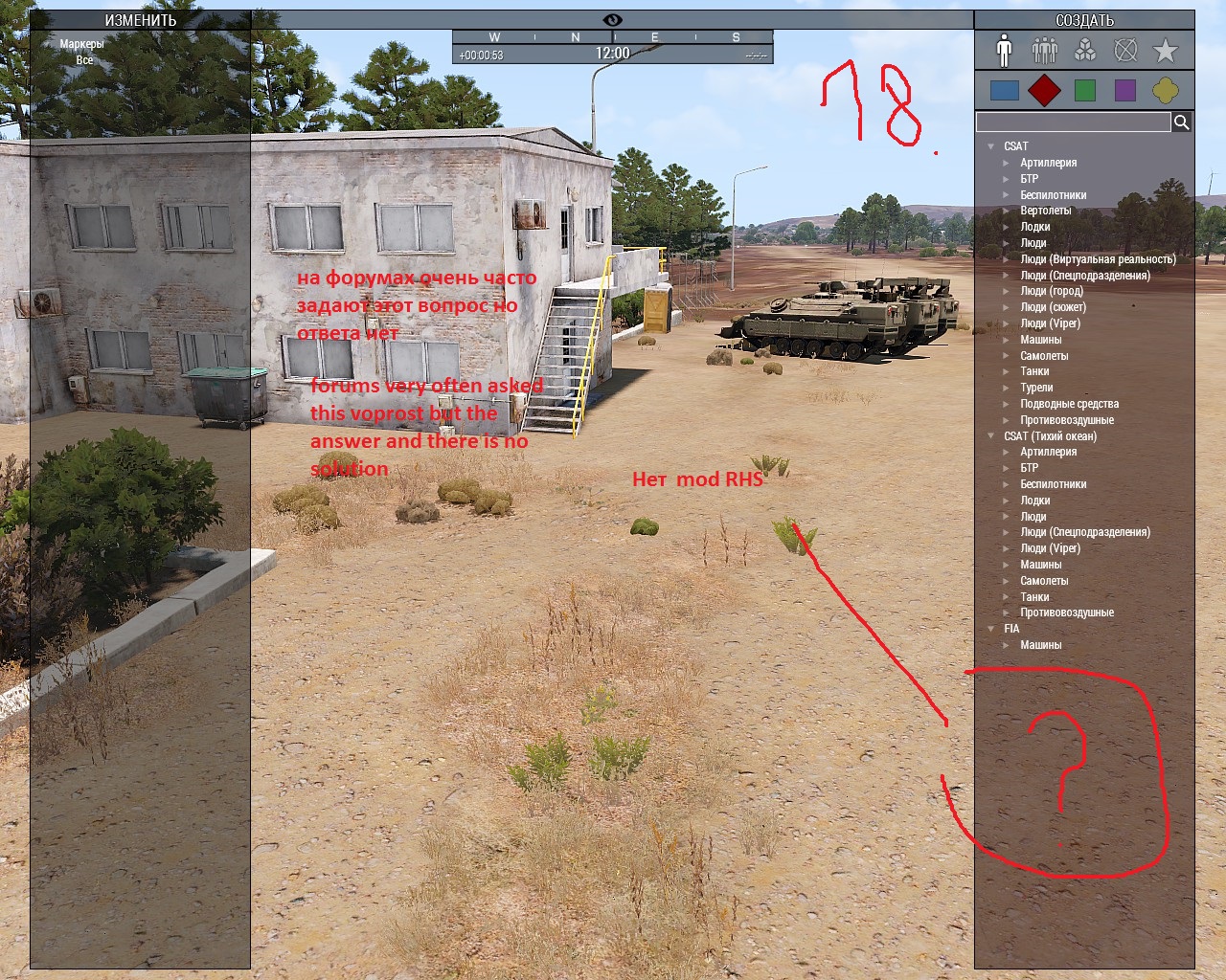 Это не ошибка!!!! Мне сказали что добавьте модуль с мода RHS в миссию в сам текстовый файл миссии SQM. Я попробовал добавил одного юнита США через редактор и после сохранения в одиночной игре Zeus стал показывать всю пехоту США, но технику не показывал, после этого я поставил технику одну единицу после сохранения стало показывать технику но некоторые единицы не показывал. Вся проблема заключается в том что в файл миссии SQM нужно прописать мод RHS все элементы тогда Zeus будет показывать все юниты RHS не зависимо стоят ли у тебя на карте в редакторе юниты или не стоят. Я не пойму я нашел на мой взгляд довольно очень серьезную ошибку которая доставляет много хлопот и не играбельность мода. Это же очень важно!!! Ведь мод RHS должен работать при всех условиях. Пожалуйста помогите с проблемой!!! |