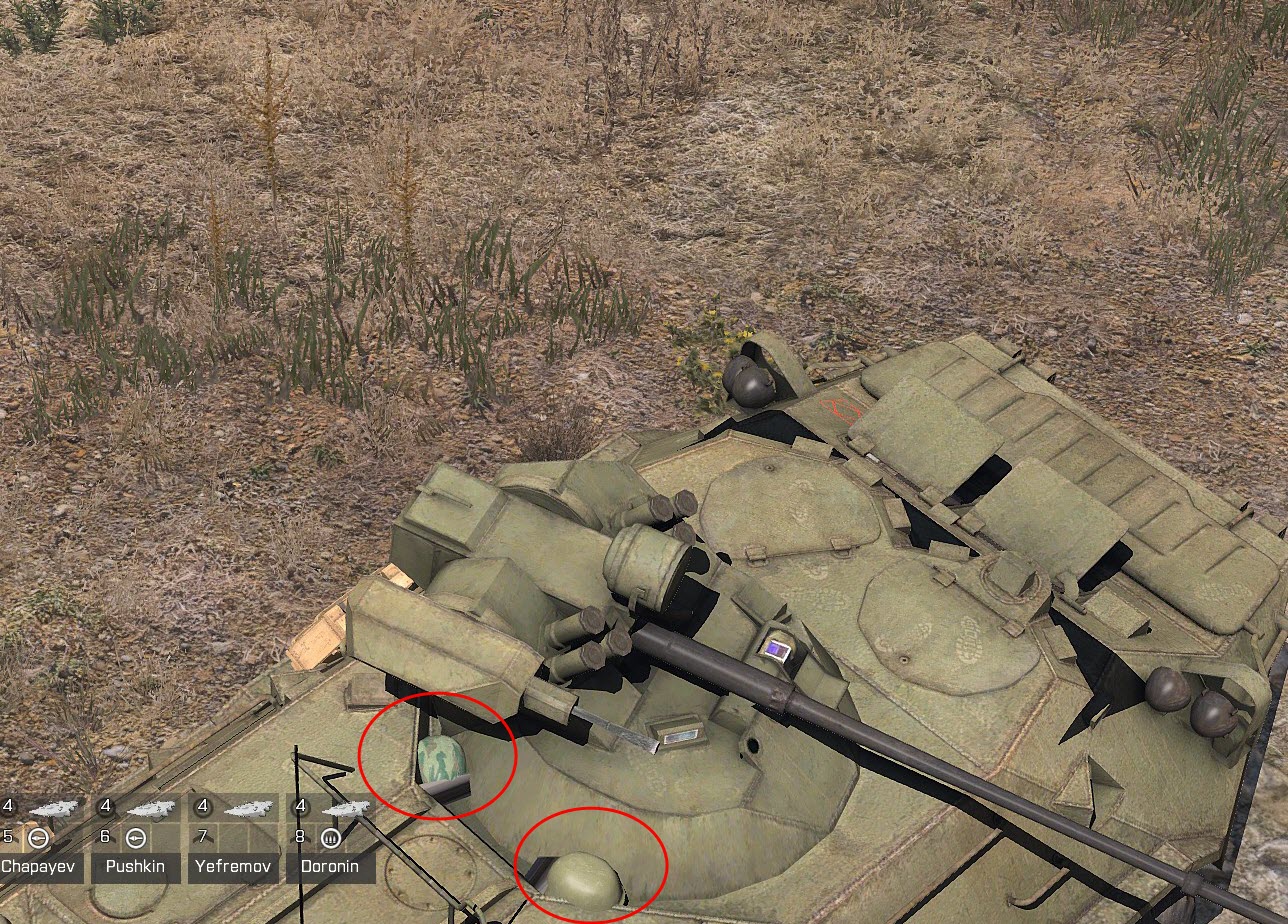 | Description | Заметил что если забить пассажирское отделение БТР-80А, то с видом от 3го лица за орудием видны каски бойцов сидящих рядом со стрелком-наводчиком, при этом внутри их каски не упираются в потолок(всё видно на скриншотах).
