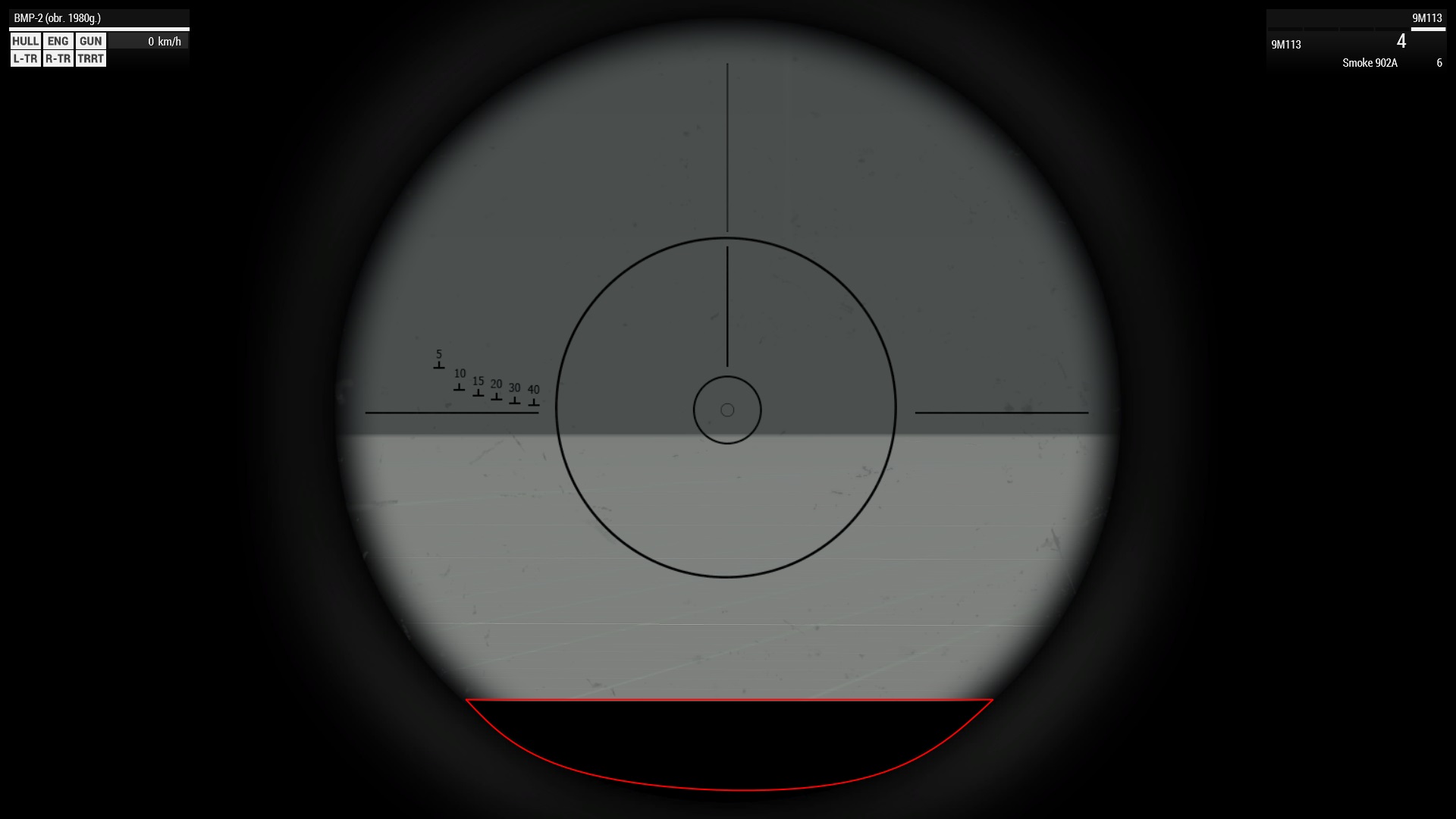 DescriptionIn all BMP-2 variants, the second level of zoom on the gunners optic has a black bar covering the bottom of the sight.