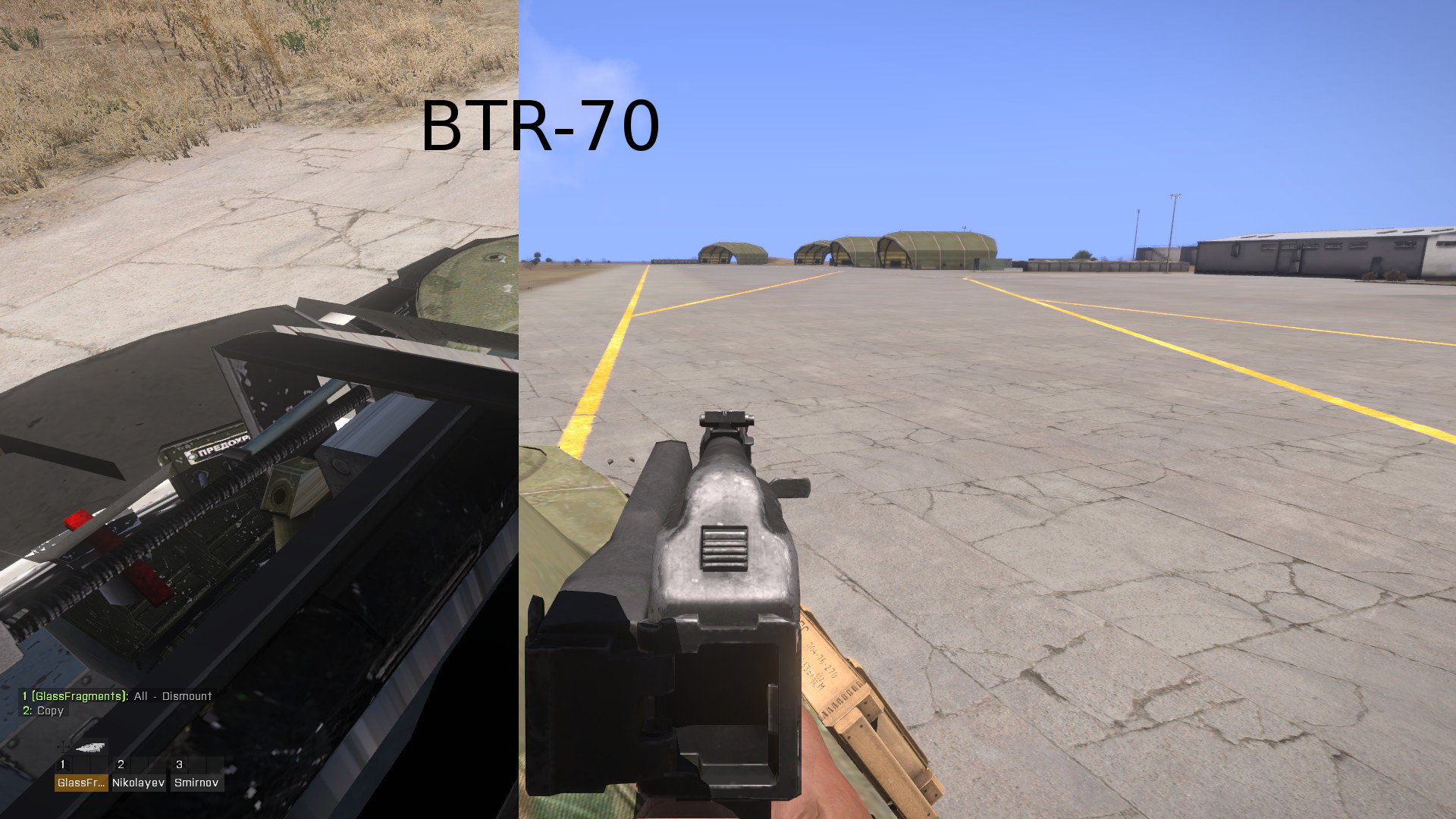 | Description | When the player is on top of a BTR or in the hatch of a Tigr, the roof of the vehicle will not render while the weapon is lowered or raised but not looking down sights. When using iron sights or scopes, the vehicle renders correctly. Additionally, the BTR FFV positions seem to be positioned and oriented wrong. This is again fixed by using sights. | ||||||||