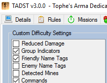 You're completely right, thanks for that. TADST actually has two difficulty setting options, one for the server that only works if the one for the mission is set to custom, which it wasn't. The issue is resolved now. Thanks much. :) |