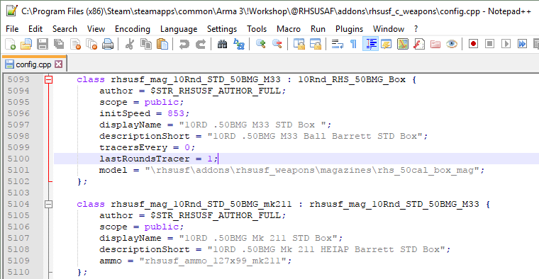 Per the code in the config of rhsusf_c_weapons, rhsusf_mag_10Rnd_STD_50BMG_M33 has lastRoundsTracer = 1, and rhsusf_mag_10Rnd_STD_50BMG_mk211 inherits its properties from that magazine. I can't think a good reason why an M107 would have a last round tracer. Most players would use the weapon as a sniper rifle instead of its real-life role of anti-materiel; the tracer would compromise your position. |