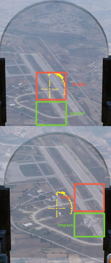 https://youtu.be/Bt8NH3DuHQ0 [^] In general it is always like this with SU-25 (A-10 and other aircraft are fine). Same with bombs, they also go below crosshair. |