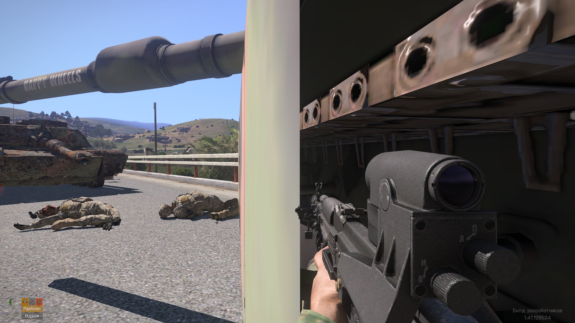 DescriptionПехотинец свободно проходит сквозь бортовой экран Абрамса и оказывается между катков)