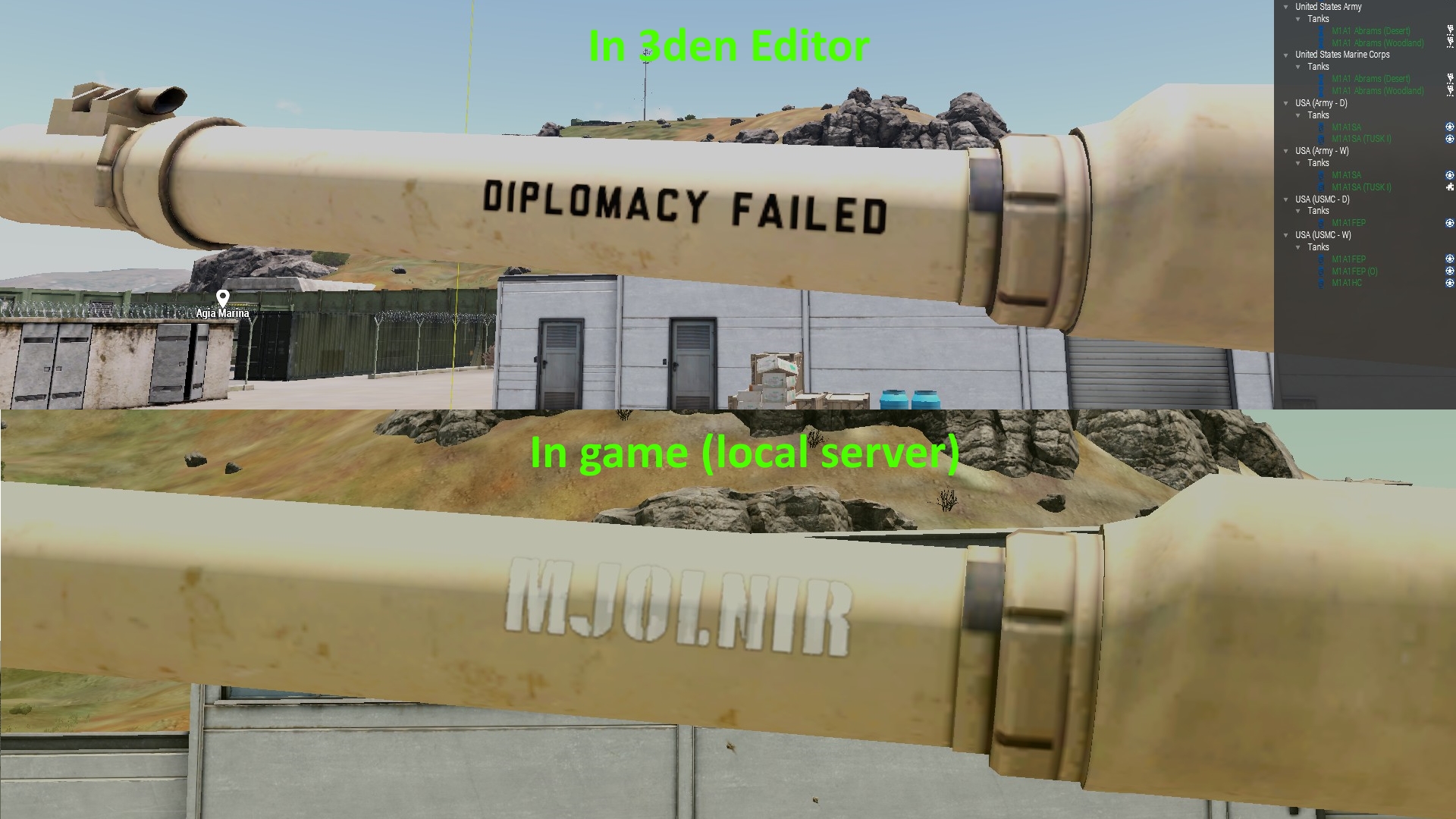 | Description | I've been trying to set a specific barrel art on M1A1 Abrams tank in Eden editor, and in the editor it seems that my desired one is set correctly. However, after I compiled it to MP ("Export to Multiplayer" from the top menu of Eden editor), run it on a server, the barrel art randomly changes to a different one. What I set was 0000030, which is "DEMOCRACY FAILED" but after running the mission, it changed to "SAY CHEESE" or something. We also placed 2 other M1A1s and set desired barrel arts respectively (I forgot which one but we equipped different ones to all 3 tanks). I've also tried on Local and result was the same. | ||||||||