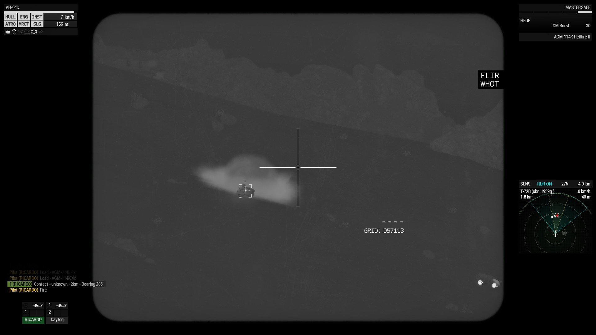 | Steps To Reproduce | 1- Open the Editor and place an Apache with the player begin the pilot and the gunner an AI. 2- Place a few MBTs on the map. I advise MBTs because they are the most heavily armored vehicles and thus aren't likely to be destroyed by a near miss which by its turn I believe makes much easier to observe what is mentioned on the Description field. 3- Fly the mission and engage the MBTs: 3.1- Select the AGM-114K (laser) as the AI gunner weapon, lock the target and order the AI to fire the AGM-114K. Note: You can use the "CTRL+Second Mouse Button" to bring up the "TADS" camera view in order to better observe the missile "spiraling" flight behavior. 3.2- Then, try using manual fire, select the AGM-114K (laser) LOBL mode, lock a target and fire. Note: You also use the "TADS" camera in order to observe the missile flight behavior just like in 3.1 4- The try the same as in 3.1 and 3.2 with the AGM-114L (radar) and you can observe a different flight profile and a much better accuracy/effectiveness by the AGM-114L (radar). 5- Actually the AGM-114L (radar) exhibits the same "spiraling" flight behavior when fired on LOAL-DIR mode. | ||||||||||||