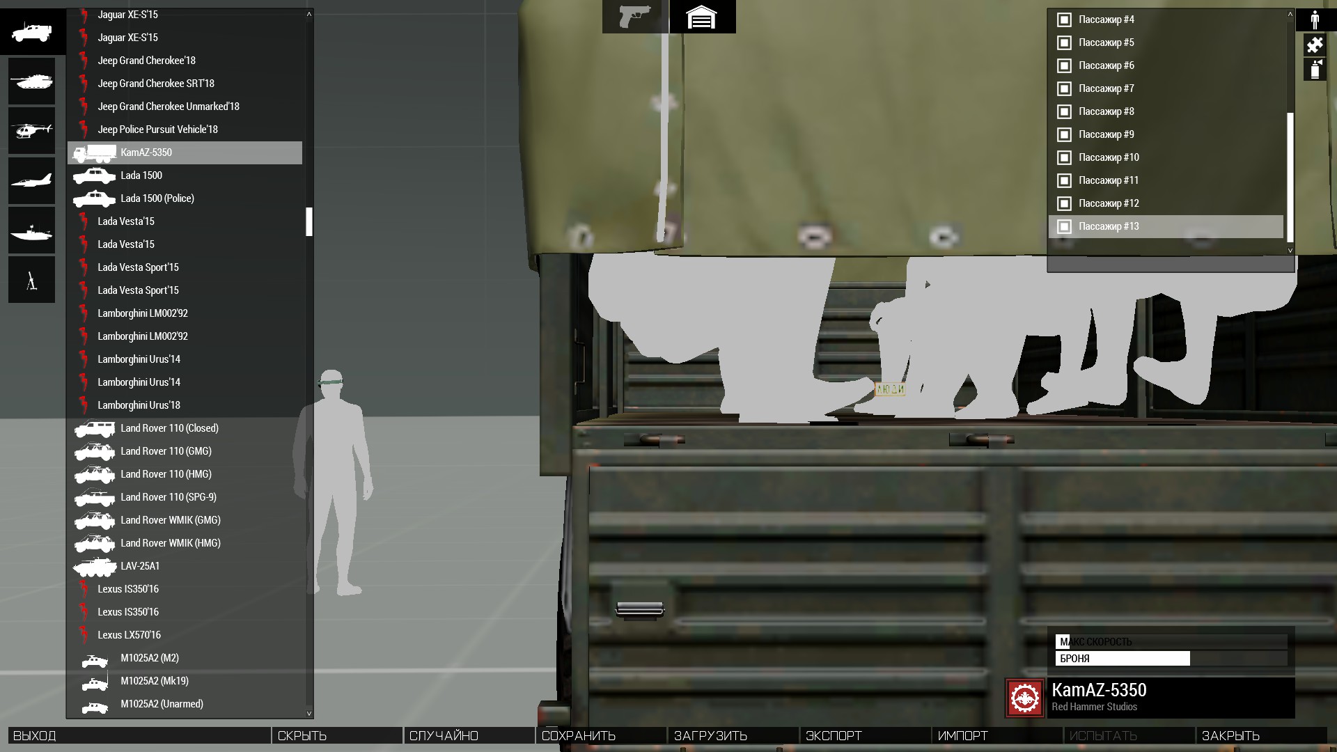 On Kamaz, I accidentally discovered in a virtual arsenal such that when the side is open, the plate weighs, as well when installing the benches, the plate changes. |