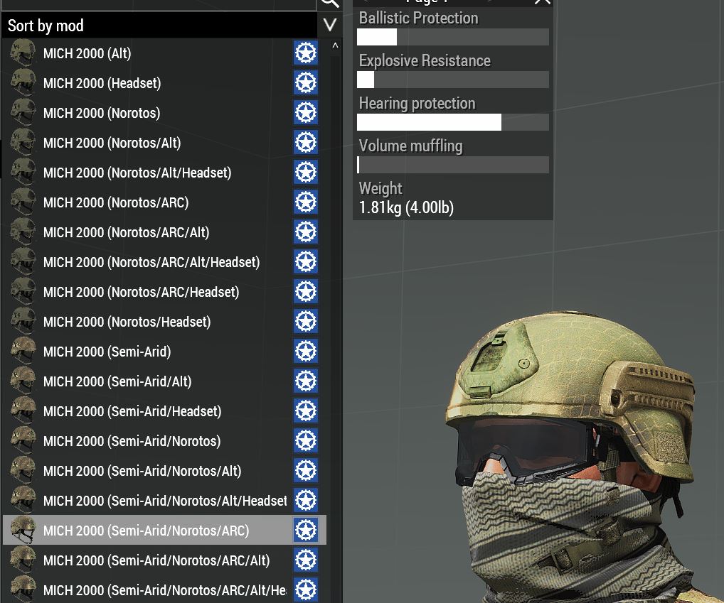 | Description | The MICH 2000 (Semi-Arid/Norotos/ARC), (rhsusf_mich_bare_norotos_arc_semi), has unwarranted hearing protection, even though the model does not include any sort of Ear-pro. Similarly, the FAST Ballistic (Multicam Cover/Headset/NSW) (rhssusf_opscore_mc_cover_pelt_nsw),FAST Ballistic (Urban Tan/Headset/NSW) (rhssusf_opscore_ut_pelt_nsw), and IHADSS (rhsusf_ihadss) have no hearing protection. | ||||||||