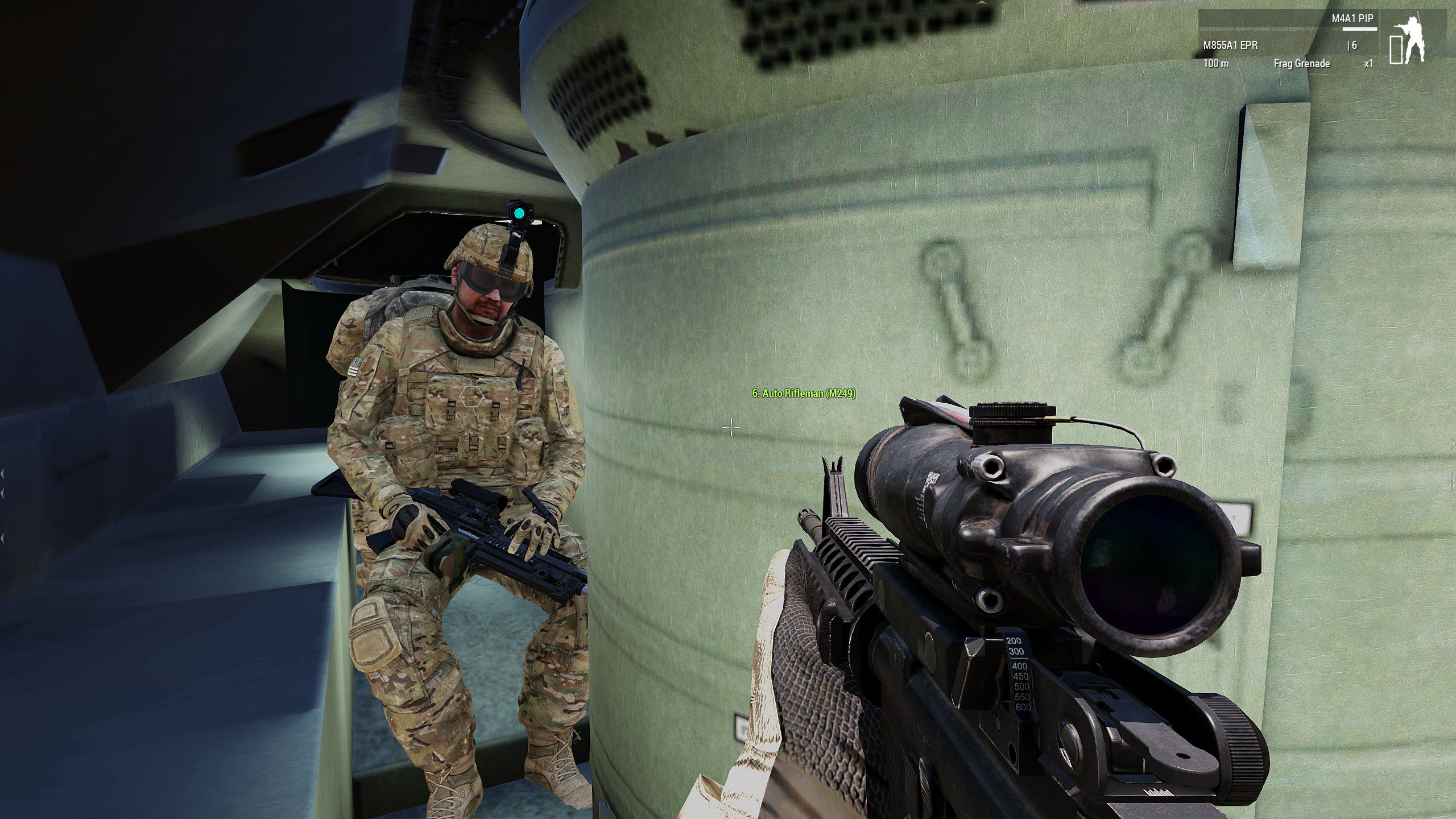 I did some testing with attachTo and he definitely fits. See picture cubby_3p.jpg. I don't know about the problem with fire geometry, can you explain? Edit: I see what you mean. If he's put further back so that his feet at on the platform, then his head clips through I can't find any real references, but according to this model: https://www.google.com/search?biw=1573&bih=805&tbm=isch&sa=1&ei=qUT3XL6_KIuHjLsP9JOA2AI&q=m2a3+bradley+interior+seating&oq=m2a3+bradley+interior+seating&gs_l=img.3...72950.74744..75367...0.0..0.58.166.3......0....1..gws-wiz-img.p8wGZIlGQ5c#imgdii=l1UFH_c2Qi8mUM:&imgrc=A_h6gAC73NqkGM: [^] The front on his seat is in line with the step, so his feet sit on the low part of the floor, like in cubby_3p. Will work I think? |