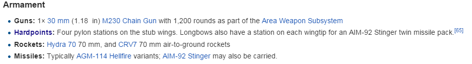 | Description | The AH-64D is not capable of equipping AIM-9 Sidewinders but rather AIM-92 Stinger missiles. In addition it equips 2 missiles per side rather than one. Just a quick thing :) wikipedia screenshot: http://puu.sh/hk915/ebbfb24526.png [^] | ||||||||||||