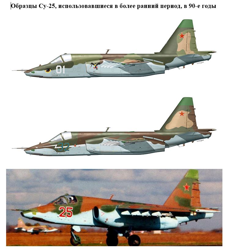Касаемо штурмовиков Су-25, имеет место та же самая проблема, имеется некоторое смешение знаков прошлого периода и тех, что используются в настоящее время. В частности, знаки 206-го ОШАП 26-й ВА БелВО и 1-й АЭ 18-го ГвШАП 303-й ШАД 1-й ВА (Грач и белая стрела), использовавшиеся на авиации в 90е годы (к слову сказать, в настоящее время этих подразделений вообще не существует, так что на серых штурмовиках этих знаков не может быть априори), представлены вместе со знаком принадлежности к ВВС РФ ("ВВС РОССИИ"), появившимся с 2009 года и не использовавшимся ранее и дублирующимся в районе килевой звезды условным бортовым номером, так же относящемуся к позднему периоду. Для более точного понимания привожу сравнительные фото. |