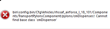 | Description | I am getting a error every time that i try to launch with USAF and the rest of RHS mods and it crashes the game before it can launch and open. it gets stuck on initializing addons and then this comes up " addon rhsgref_main requires addon rhs_main_loasorder . then when i click okay another error comes up saying " bin/config.bin/CfgVehicles/rhssaf_airforce_l_18_101/Components/TransportPylonsComponent/pylons/cmDispenser/: Cannot find base class "cmDispenser" " this one is the main issue please help | ||||||||