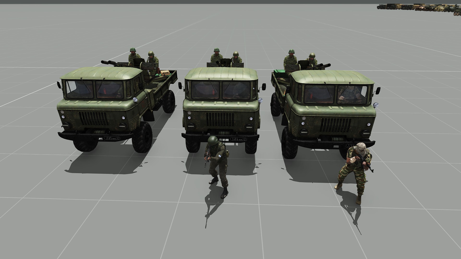 | Additional Information | Screenshot shows the RHS AFRF Russia MSV GAZ-66 ZU-23-2 vehicle in the following configurations: Left: Default Center: Custom crew, OPFOR Right: Custom crew, INFOR The custom crewmember is positioned in front of the center and right vehicle. The driver adopts this loadout, but as can be seen in the screenshot, the gunner and commander does not. | ||||||||