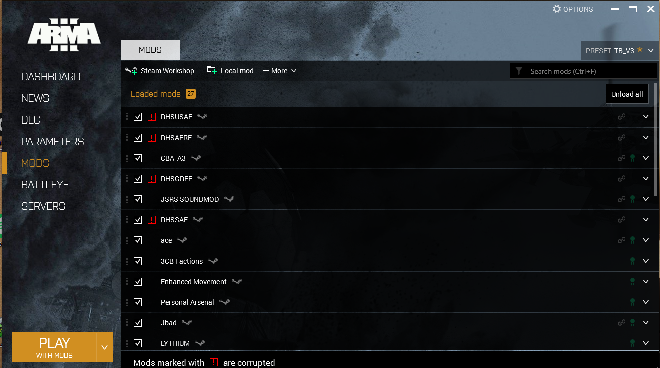 | Description | RHSUSAF, RHSAFRF, RHSGREF, RHSSAF are corrupted and they are stopping me from playing on a specific server. I have tried to repair them, I have reinstalled them aswell as the other mods in the preset and I have also validated the game files with no success. |