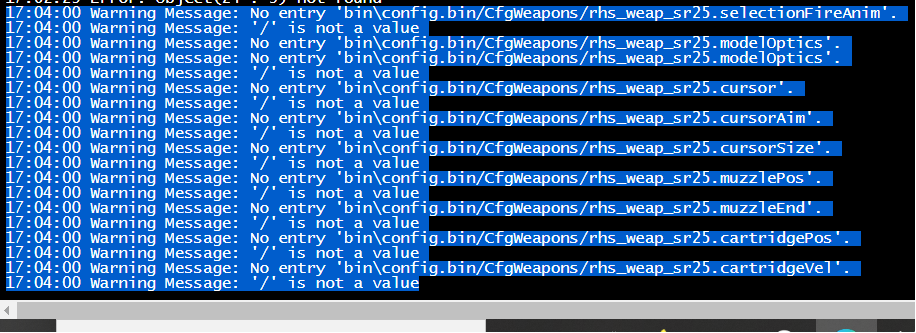 | Description | We've been seeing this warning pop up in the server logs when anyone picks up the rifle, the rifle can be used but every time it is used the same warning pops up. 23:43:22 Warning Message: No entry 'bin\config.bin/CfgWeapons/rhs_weap_sr25.nameSound'. 23:43:22 Warning Message: '/' is not a value 23:43:22 Warning Message: No entry 'bin\config.bin/CfgWeapons/rhs_weap_sr25.type'. 23:43:22 Warning Message: '/' is not a value 23:43:22 Warning Message: No entry 'bin\config.bin/CfgWeapons/rhs_weap_sr25.simulation'. 23:43:22 Warning Message: '/' is not a value 23:43:22 Warning Message: No entry 'bin\config.bin/CfgWeapons/rhs_weap_sr25.fireLightDuration'. 23:43:22 Warning Message: '/' is not a value 23:43:22 Warning Message: No entry 'bin\config.bin/CfgWeapons/rhs_weap_sr25.fireLightIntensity'. 23:43:22 Warning Message: '/' is not a value 23:43:22 Warning Message: No entry 'bin\config.bin/CfgWeapons/rhs_weap_sr25.fireLightDiffuse'. 23:43:22 Warning Message: Size: '/' not an array 23:43:22 Warning Message: Size: '/' not an array 23:43:22 Warning Message: No entry 'bin\config.bin/CfgWeapons/rhs_weap_sr25.fireLightAmbient'. 23:43:22 Warning Message: Size: '/' not an array 23:43:22 Warning Message: Size: '/' not an array 23:43:22 Warning Message: No entry 'bin\config.bin/CfgWeapons/rhs_weap_sr25.weaponLockDelay'. 23:43:22 Warning Message: '/' is not a value 23:43:22 Warning Message: No entry 'bin\config.bin/CfgWeapons/rhs_weap_sr25.weaponLockSystem'. 23:43:22 Warning Message: '/' is not a value 23:43:22 Warning Message: No entry 'bin\config.bin/CfgWeapons/rhs_weap_sr25.cmImmunity'. 23:43:22 Warning Message: '/' is not a value 23:43:22 Warning Message: No entry 'bin\config.bin/CfgWeapons/rhs_weap_sr25.weight'. 23:43:22 Warning Message: '/' is not a value 23:43:22 Warning Message: No entry 'bin\config.bin/CfgWeapons/rhs_weap_sr25.lockingTargetSound'. 23:43:22 Warning Message: Size: '/' not an array 23:43:22 Warning Message: No entry 'bin\config.bin/CfgWeapons/rhs_weap_sr25.lockedTargetSound'. 23:43:22 Warning Message: Size: '/' not an array 23:43:22 Warning Message: No entry 'bin\config.bin/CfgWeapons/rhs_weap_sr25.detectRange'. 23:43:22 Warning Message: '/' is not a value 23:43:22 Warning Message: No entry 'bin\config.bin/CfgWeapons/rhs_weap_sr25.magazineReloadTime'. 23:43:22 Warning Message: '/' is not a value 23:43:22 Warning Message: No entry 'bin\config.bin/CfgWeapons/rhs_weap_sr25.drySound'. 23:43:22 Warning Message: Size: '/' not an array 23:43:22 Warning Message: No entry 'bin\config.bin/CfgWeapons/rhs_weap_sr25.zeroingSound'. 23:43:22 Warning Message: Size: '/' not an array 23:43:22 Warning Message: No entry 'bin\config.bin/CfgWeapons/rhs_weap_sr25.soundContinuous'. 23:43:22 Warning Message: '/' is not a value 23:43:22 Warning Message: No entry 'bin\config.bin/CfgWeapons/rhs_weap_sr25.reloadSound'. 23:43:22 Warning Message: Size: '/' not an array 23:43:22 Warning Message: No entry 'bin\config.bin/CfgWeapons/rhs_weap_sr25.changeFiremodeSound'. 23:43:22 Warning Message: Size: '/' not an array 23:43:22 Warning Message: No entry 'bin\config.bin/CfgWeapons/rhs_weap_sr25.reloadMagazineSound'. 23:43:22 Warning Message: Size: '/' not an array 23:43:22 Warning Message: No entry 'bin\config.bin/CfgWeapons/rhs_weap_sr25.soundBullet'. 23:43:22 Warning Message: Size: '/' not an array 23:43:22 Warning Message: Size: '/' not an array 23:43:22 Warning Message: No entry 'bin\config.bin/CfgWeapons/rhs_weap_sr25.aiDispersionCoefX'. 23:43:22 Warning Message: '/' is not a value 23:43:22 Warning Message: No entry 'bin\config.bin/CfgWeapons/rhs_weap_sr25.aiDispersionCoefY'. 23:43:22 Warning Message: '/' is not a value 23:43:22 Warning Message: No entry 'bin\config.bin/CfgWeapons/rhs_weap_sr25.canLock'. 23:43:22 Warning Message: '/' is not a value 23:43:22 Warning Message: No entry 'bin\config.bin/CfgWeapons/rhs_weap_sr25.lockAcquire'. 23:43:22 Warning Message: '/' is not a value 23:43:22 Warning Message: No entry 'bin\config.bin/CfgWeapons/rhs_weap_sr25.ballisticsComputer'. 23:43:22 Warning Message: '/' is not a value 23:43:22 Warning Message: No entry 'bin\config.bin/CfgWeapons/rhs_weap_sr25.enableAttack'. 23:43:22 Warning Message: '/' is not a value 23:43:22 Warning Message: No entry 'bin\config.bin/CfgWeapons/rhs_weap_sr25.optics'. 23:43:22 Warning Message: '/' is not a value 23:43:22 Warning Message: No entry 'bin\config.bin/CfgWeapons/rhs_weap_sr25.primary'. 23:43:22 Warning Message: '/' is not a value 23:43:22 Warning Message: No entry 'bin\config.bin/CfgWeapons/rhs_weap_sr25.showSwitchAction'. 23:43:22 Warning Message: '/' is not a value 23:43:22 Warning Message: No entry 'bin\config.bin/CfgWeapons/rhs_weap_sr25.showEmpty'. 23:43:22 Warning Message: '/' is not a value 23:43:22 Warning Message: No entry 'bin\config.bin/CfgWeapons/rhs_weap_sr25.autoReload'. 23:43:22 Warning Message: '/' is not a value 23:43:22 Warning Message: No entry 'bin\config.bin/CfgWeapons/rhs_weap_sr25.backgroundReload'. 23:43:22 Warning Message: '/' is not a value 23:43:22 Warning Message: No entry 'bin\config.bin/CfgWeapons/rhs_weap_sr25.showAimCursorInternal'. 23:43:22 Warning Message: '/' is not a value 23:43:22 Warning Message: No entry 'bin\config.bin/CfgWeapons/rhs_weap_sr25.irDistance'. 23:43:22 Warning Message: '/' is not a value 23:43:22 Warning Message: No entry 'bin\config.bin/CfgWeapons/rhs_weap_sr25.irDotIntensity'. 23:43:22 Warning Message: '/' is not a value 23:43:22 Warning Message: No entry 'bin\config.bin/CfgWeapons/rhs_weap_sr25.fireSpreadAngle'. 23:43:22 Warning Message: '/' is not a value 23:43:22 Warning Message: No entry 'bin\config.bin/CfgWeapons/rhs_weap_sr25.opticsZoomMax'. 23:43:22 Warning Message: '/' is not a value 23:43:22 Warning Message: No entry 'bin\config.bin/CfgWeapons/rhs_weap_sr25.opticsZoomInit'. 23:43:22 Warning Message: '/' is not a value 23:43:22 Warning Message: No entry 'bin\config.bin/CfgWeapons/rhs_weap_sr25.distanceZoomMin'. 23:43:22 Warning Message: '/' is not a value 23:43: