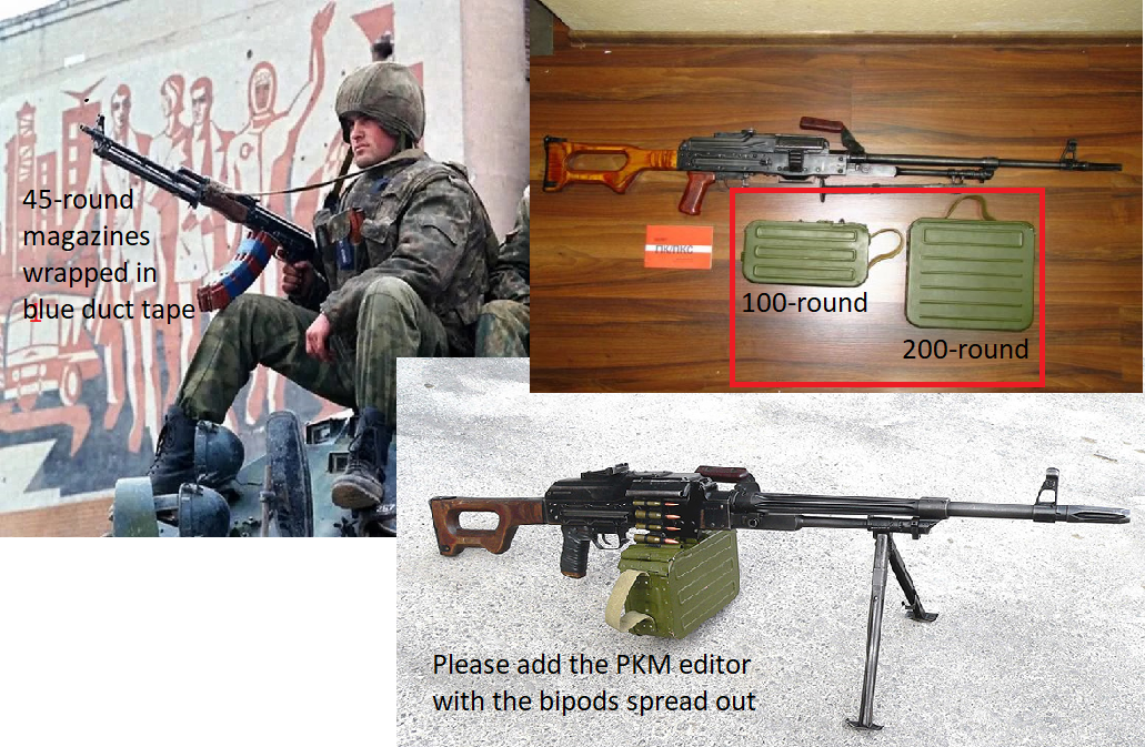 | Description | Hello. 1) Interested in a question about adding 45-round magazines wrapped in blue duct tape to the AK-74 RHS AFRF family of submachine guns Can I expect them in the next update? 2)will a 200-round PKM box be added? 3)Please add the PKM editor with the bipods spread out | ||||||||