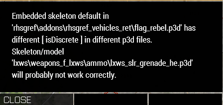 | Description | Whenever RHSGREF and Western Sahara cDLC are loaded together and during a mission flag_rebel.p3d is used, and someone spawns SLR HE grenade (just it or a gun with it), it causes an error to pop up: "Embedded skeleton default in 'rhsgref\addons\rhsgref_vehicles_ret\flag_rebel.p3d' has different [ isDiscrete ] in different p3d files. Skeleton/model 'lxws\weapons_f_lxws\ammo\lxws_slr_grenade_he.p3d' will probably not work correctly". Depending on whether the error pops up in the briefing screen or during the mission itself, it can freeze the game. | ||||||||