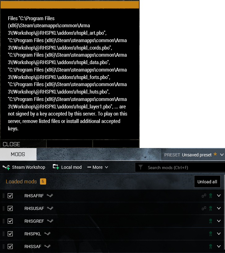 Great, then the issue is actually that I am not able to get in with the Steam workshop files. So I am getting an error saying the key for the file is not accepted. I posted a pic (RHS2) of the error. Additionally, pic includes the 5 RHS mods I have subscribed to. |