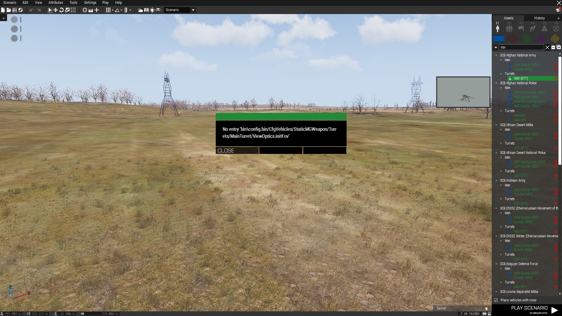 | Description | I have noticed that with many of the static weapons from many RHS factions and ones that use RHS the M2 variants, NSV, MK19s all are giving me a ntofication of missing optics for them so when I get on them as a gunner and look down the sights i get zoomed in alot and barely move the weapon unless i am in first person free view or third person. Vanilla weapons like the SOG weapons all work fine with no issue. either in my Dedicated Antistasi server or in eden editor i get the notification saying; No entry 'bin\cinfig.bin/CfgVehicles/StaticWeapon/Turrets/MainTurret/viewOptics.initFov' | ||||||||||||